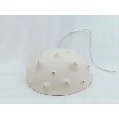 Suspension en grès brut blanc et cordon en tissus blanc.